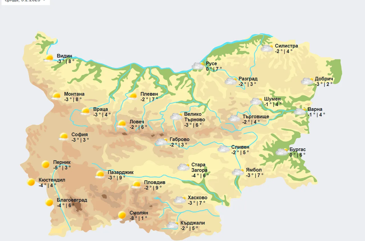 Ще бъде предимно слънчево с максимални температури между 7° и 12°
